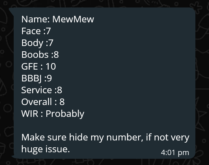 CumOnBoobs(Tip), CumOnFace(Tip), Massage(10mins), French-Kiss, BB-BlowJob, FuckJob, DATY, 69